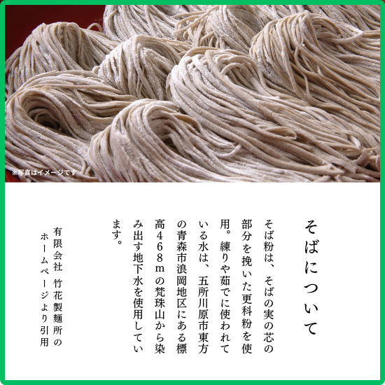 【調理方法】 たっぷりの沸騰したお湯で6分前後茹でてください。流水でそば表面のヌメリを洗い流し、充分に水気を切って器に盛り付けしてください。ねぎ、わさびなどの薬味を加えますと一層美味しく召し上がれます。